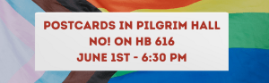 POSTCARDS IN PILGRIM HALL – On Wednesday, June 1st, we’ll be gathering in Pilgrim Hall from 6:30 – 8:30 pm to write postcards to Ohio legislators, urging them to vote “no” on House Bill 616. If you are not familiar with this bill, you can review the content and summary here: https://ohiohouse.gov/legislation/134/hb616