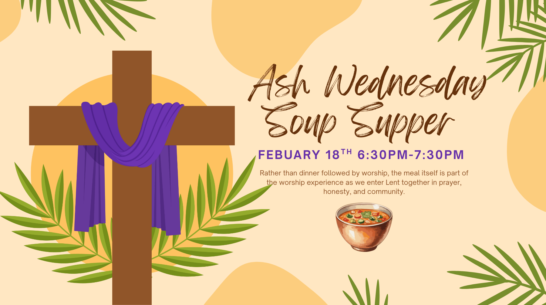 Join us as we begin the season of Lent with a worshipful soup supper in Pilgrim Hall. This Ash Wednesday gathering will weave together a shared meal, communion, singing, special music from the choir, reflection on masks and unmasking, and the imposition of ashes — all as one service of worship! Rather than dinner followed by worship, the meal itself is part of the worship experience as we enter Lent together in prayer, honesty, and community. We are seeking three volunteers to provide soup (including one vegetarian